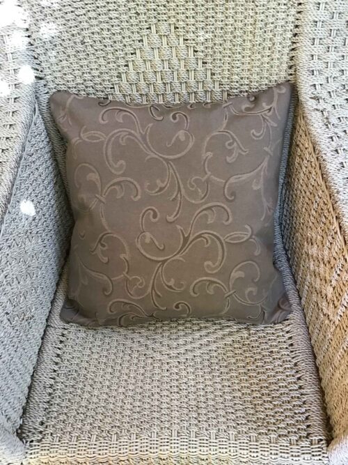 45cm x 45cm scatter cushion covers with zipper opening in bottom seam of cushions. Cotton blend fabric in brown colours with a scroll print.