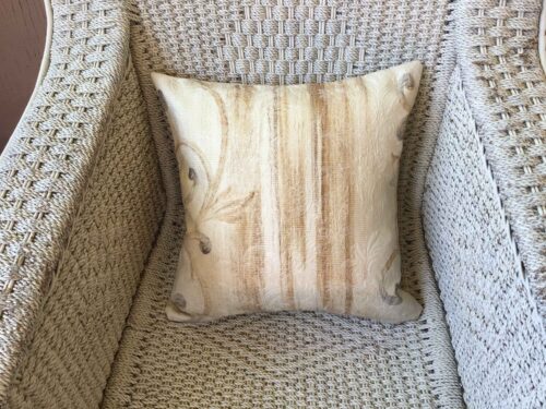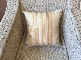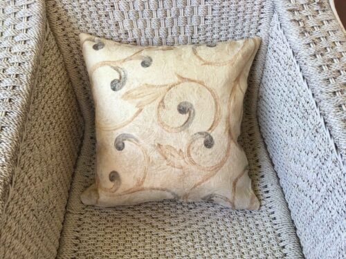 40cm x 4ocm scatter cushion cover with zipper opening in bottom seam of cushion. Cream textured fabric with charcoal & chestnut brown scroll design on one side of cushion and co-ordinating vertical stripe design on the other side of cushion.
