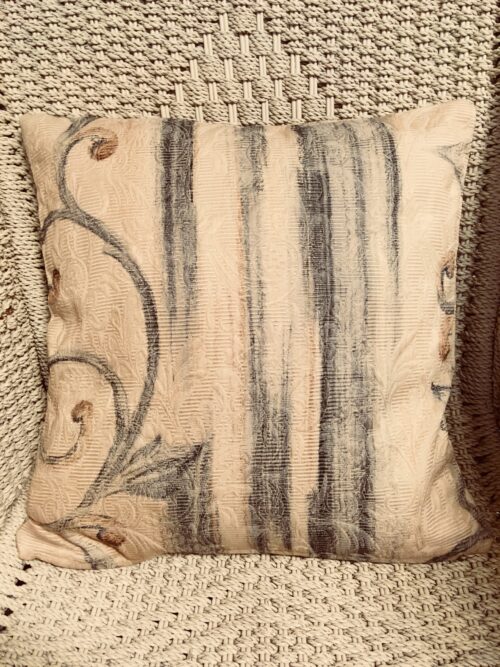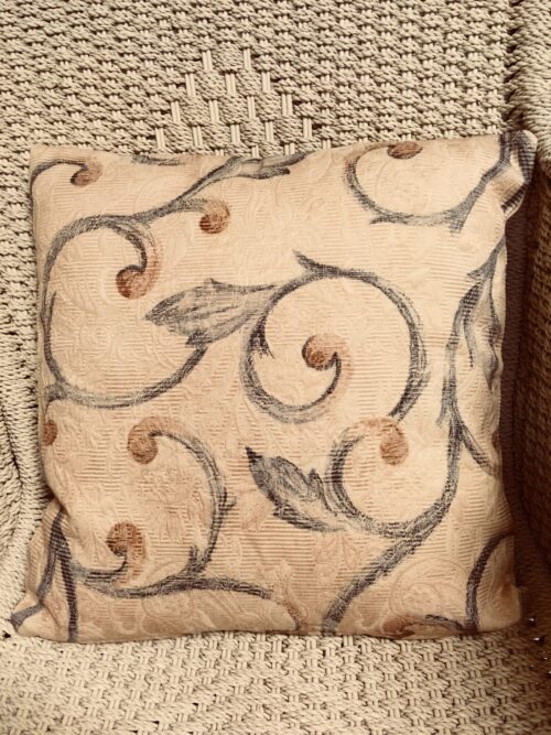 40cm x 40cm scatter cushion cover with zipper opening in bottom seam of cushion. Textured caramel fabric with chocolate & caramel scroll design on one side & stripe design on the other side.