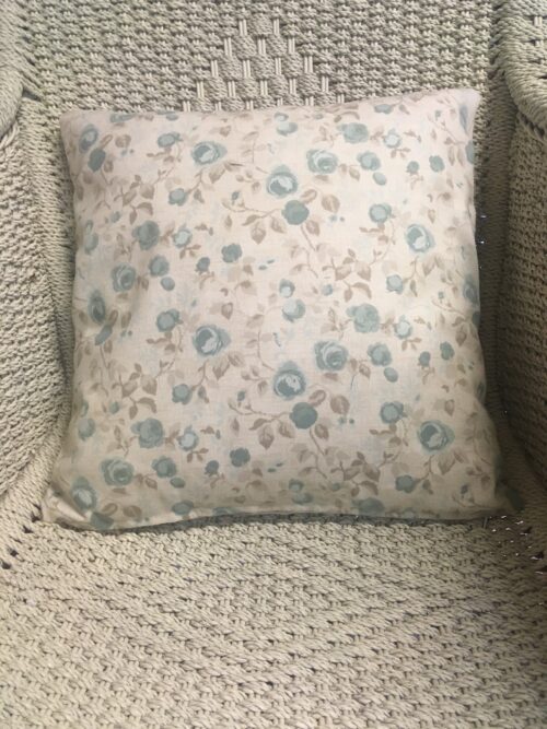 45cm x 45cm scatter cushion cover with zipper opening in bottom seam of cushion. Cotton fabric with aqua & taupe small floral design.